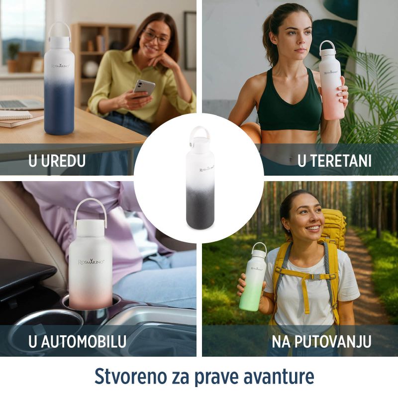 Termosica Rosmarino Ombre omogućuje vam uživanje u omiljenom napitku savršene temperature u bilo kojem trenutku. Napredna tehnologija dvostrukih stijenki osigurava da vaša jutarnja kava ostane vruća do kasnog poslijepodneva, a ledena voda ostaje osvježavajuće hladna čak i nakon večernjeg treninga. Ergonomski dizajnirana ručka osigurava udobno nošenje, dok elegantna silueta termosice savršeno pristaje u vašu torbu ili ruksak. S velikodušnim volumenom od 600 ml osigurava optimalnu hidrataciju, dok njen šarmantni ombre dizajn dodaje dašak profinjenosti vašoj svakodnevici.